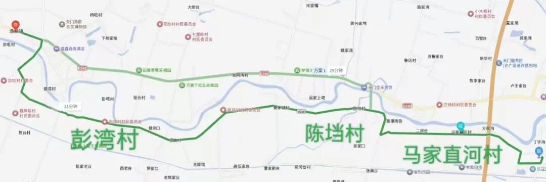 路线五:天门河以南,罗口、彭湾,涂咀等地区居民,可从天门市西环路中国燃气发展有限公司旁走竟彭线,经熊河社区、马家直河村、陈垱村、彭湾村前往渔薪方向。