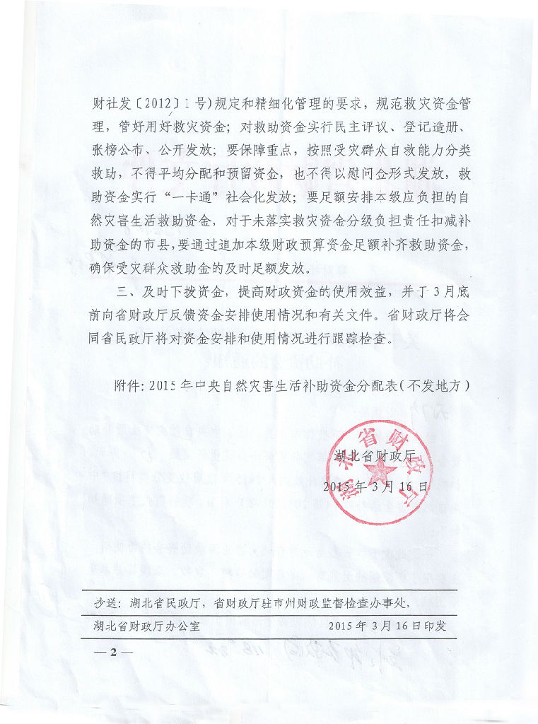 2015年蒋湖农场自然灾害生活补助资金