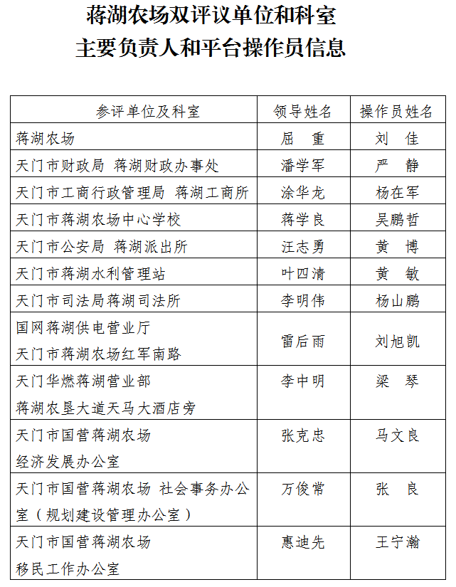 蒋湖农场办公室关于印发《蒋湖农场双评议单位和科室主要负责人和平台操作员信息》的通知
