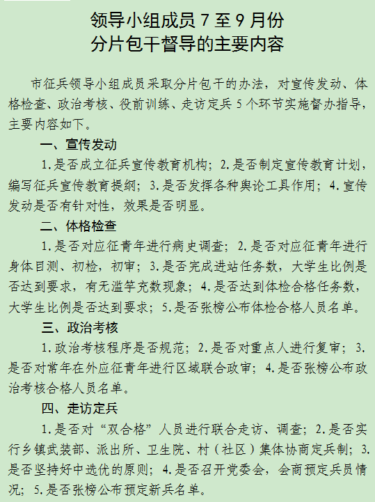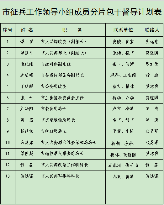 为切实加强对征兵工作的组织领导,市成立征兵工作领导小组,市委书记、市长庄光明任组长,市委常委、市政府党组成员董青平、市委常委、市人武部政委谭祥、市人武部部长陈国平、市政府办公室主任高文博任副组长,市政府办副主任谭纪刚、市委宣传部常务副部长沈松峰、市公安局政委丁明辉、市卫生健康委员会主任张叶、市教育局局长刘华阳、市交通运输局局长黄罡、市财政局局长杨铁柱、市人力资源和社会保障局局长马满意、市退役军人事务局局长梁世超、市人武部军事科科长聂远谋、市人武部政工科科长舒淼、市人武部保障科科长欧勇军任领导小组成员。市征兵领导小组成员采取分片包干的形式,对全市所属各单位征兵工作进行检查督导,7-9月份,主要督导宣传发动、目测初检、进站体检、任务完成和兵员初定等环节工作。(具体联系单位及督导内容见附件3、4)
