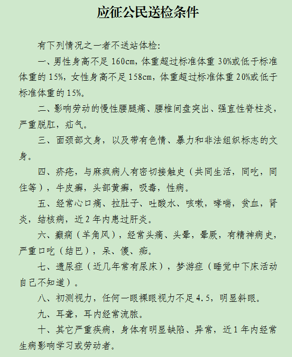 3。体格条件。按照国防部征兵办公室2014年印发的《应征公民体格检查标准》和《应征公民体格检查办法》执行。