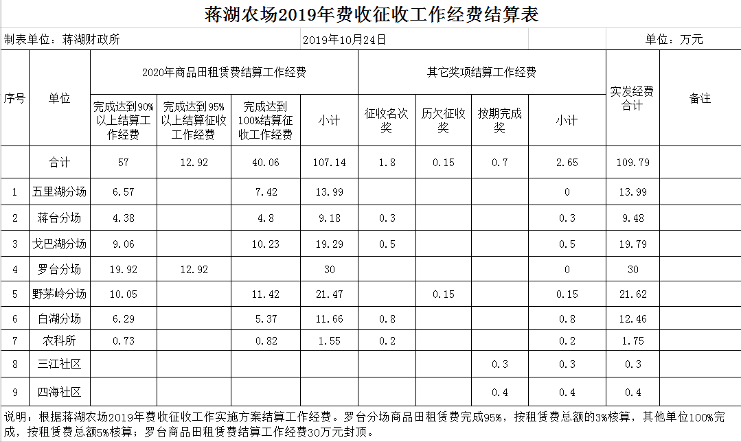按照《蒋湖农场2019年费收征收工作实施方案》,根据各单位上缴费收资金比例和节点任务完成情况,在核拨单位工作人员基本工资和征收工作绩效工资的基础上,结算工作经费如下:白湖分场2020年商品田租赁费结算工作经费11.66万元,完成任务排名第一,结算奖励经费0.8万元,合计12.46万元;农科所2020年商品田租赁费结算工作经费1.55万元,任务排名靠前,结算奖励经费0.2万元,合计1.75万元;戈巴湖分场2020年商品田租赁费结算工作经费19.29万元,完成任务排名第二,结算奖励经费0.5万元,合计19.79万元;蒋台分场2020年商品田租赁费结算工作经费9.18万元,完成任务排名第三,结算奖励经费0.3万元,合计9.48万元;野茅岭分场2020年商品田租赁费结算工作经费21.47万元,回收历欠结算工作经费0.15万元,合计21.62万元;五里湖分场2020年商品田租赁费结算工作经费13.99万元;罗台分场2020年商品田租赁费结算工作经费30万元;四海社区提前完成2019年养老保险金征收任务,结算工作经费0.4万元;三江社区提前完成2019年养老保险金征收任务,结算工作经费0.3万元。
