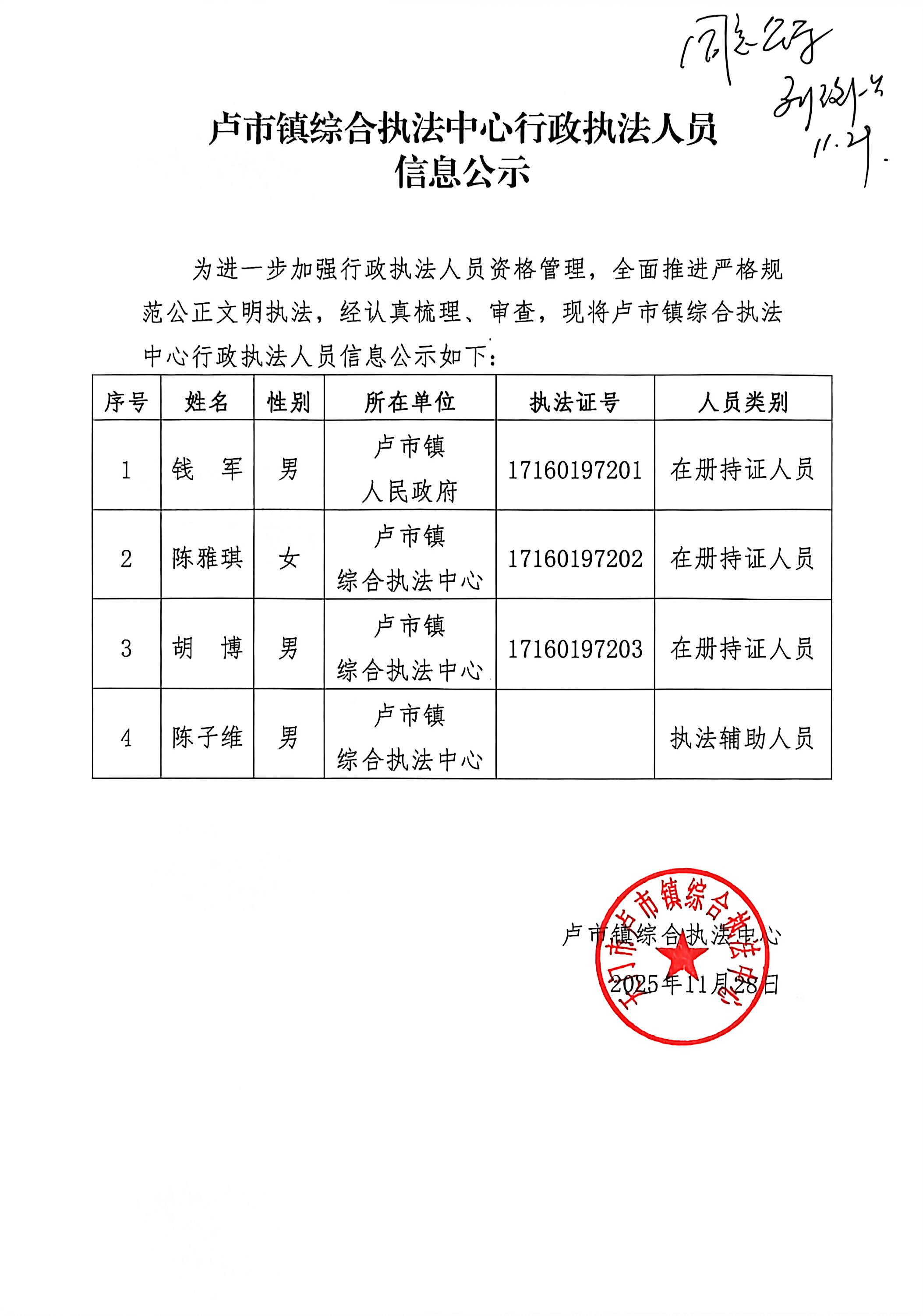 卢市镇人民政府行政执法主体公示