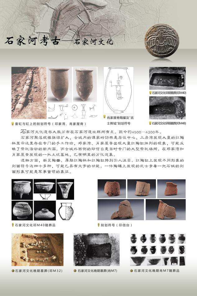 新石器时代聚落遗址“中华第一凤、中华第一虎、中华第一酒、中华第一城”的发现,佐证了长江文化与黄河文化同为中华民族文明起源;史前土城遗址肖家屋脊、邓家湾、谭家岭、印信台的考古发现填补了华夏五千年文明史的空白。以石家河命名的石家河文化代表了长江中下游地区乃至亚洲史前文明发展的最高水平,在中华文明起源与发展史上占有十分重要的地位。