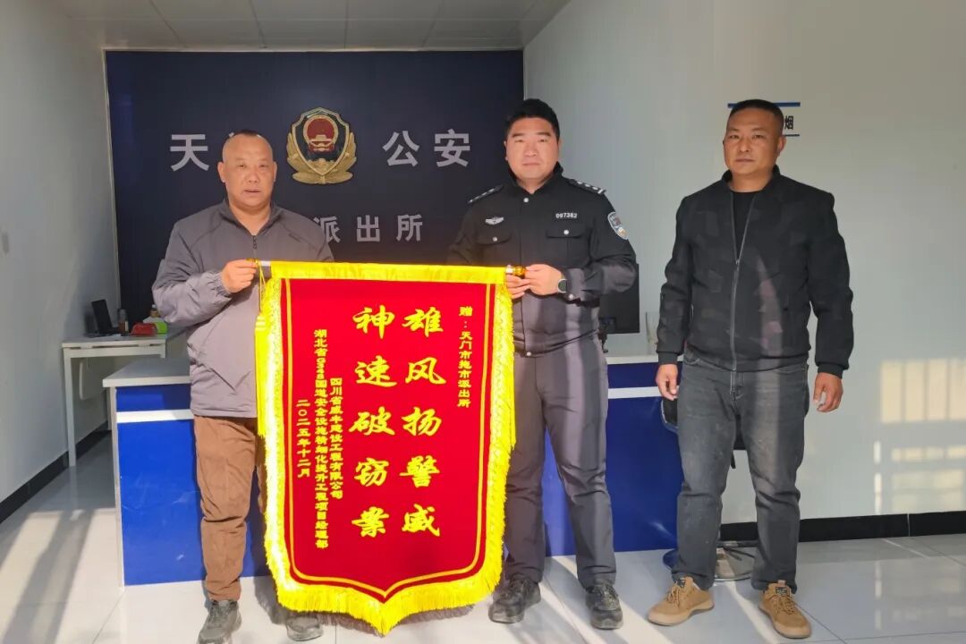 12月2日,天门市公安局拖市派出所收到辖区国道工程项目部送来的锦旗,感谢民警快速侦破案件,及时追回被盗立柱,避免影响工程进度,为企业挽回经济损失。