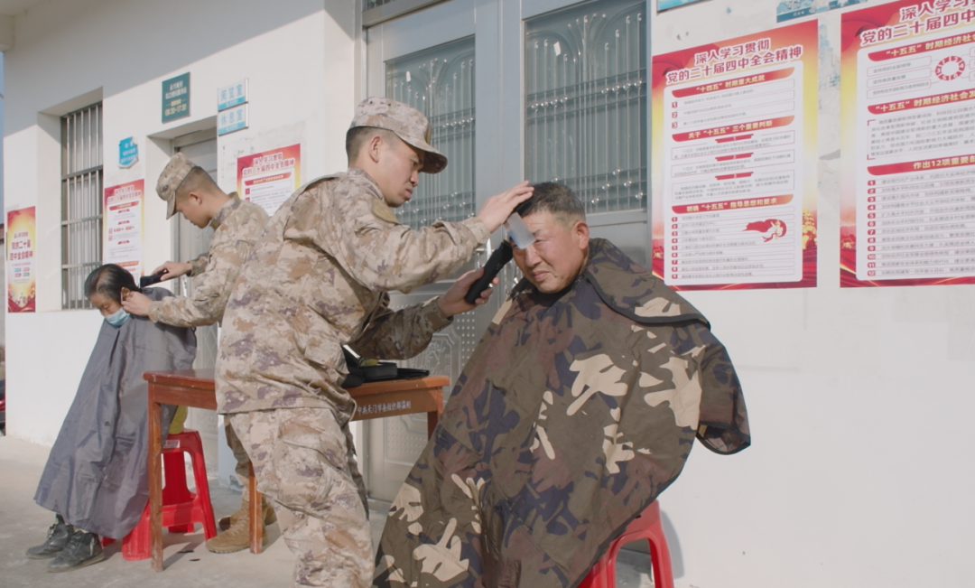 楼前空地上,“爱心义剪”服务点前笑语连连,便民理发分队正在为村民进行义务理发。