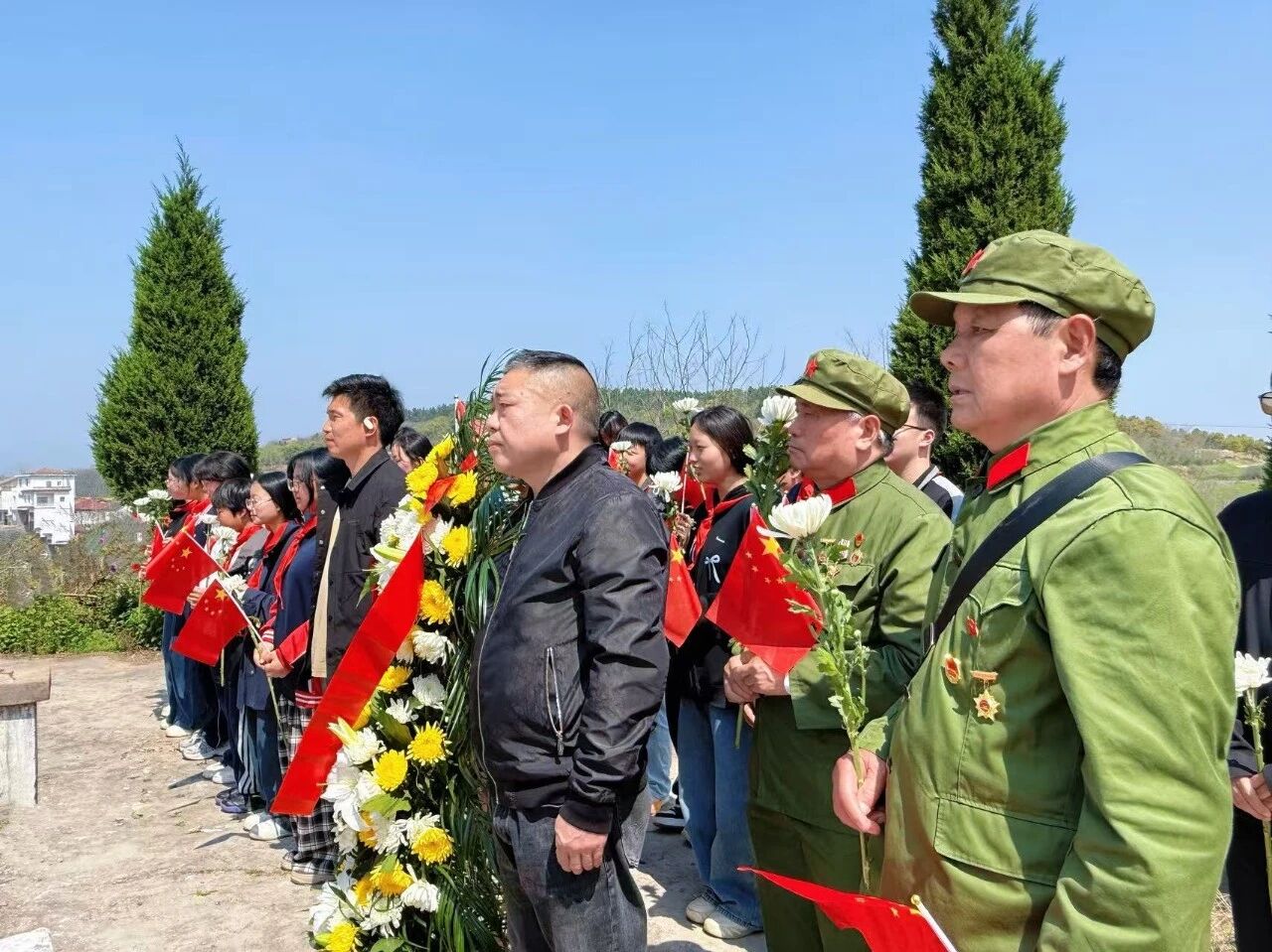 活动当天,全体人员有序集结出发,老军人身着军装、胸佩勋章,新民兵军姿挺拔、精神抖擞,青少年手持国旗、朝气蓬勃,不同时代、不同身份的参与者因缅怀英烈的共同心愿携手同行。在青山烈士纪念碑前,全体人员整齐列队,奏唱国歌、集体默哀、敬献花篮,以庄严的公祭仪式表达对革命先烈的崇高敬意与深切哀思。在赵场村李攀峰烈士墓前,志愿者擦拭墓碑,向烈士敬献鲜花,老兵们结合亲身经历,为在场民兵讲述烽火岁月的战斗故事,让英雄形象变得可感可知,实现与英烈的精神对话。