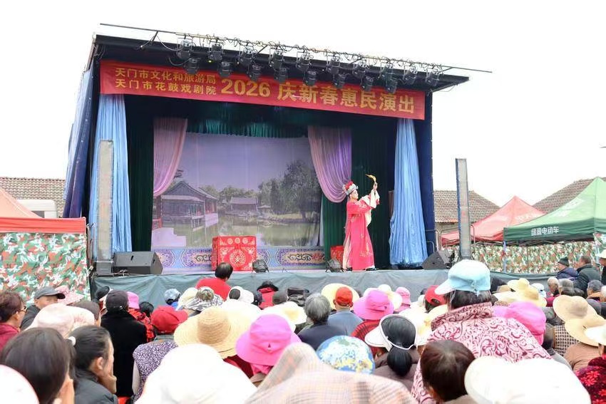 由天门市文化和旅游局主办、天门市花鼓戏剧院承办的“2026庆新春惠民演出”于3月4日至3月6日在毛巷村举行。三天时间里,《花墙会》《秦雪梅》《杨八姐游春》《宝莲灯》以及经典大戏《断臂姻缘》上下集轮番上演,将传统戏曲的魅力实实在在送到老百姓的家门口。