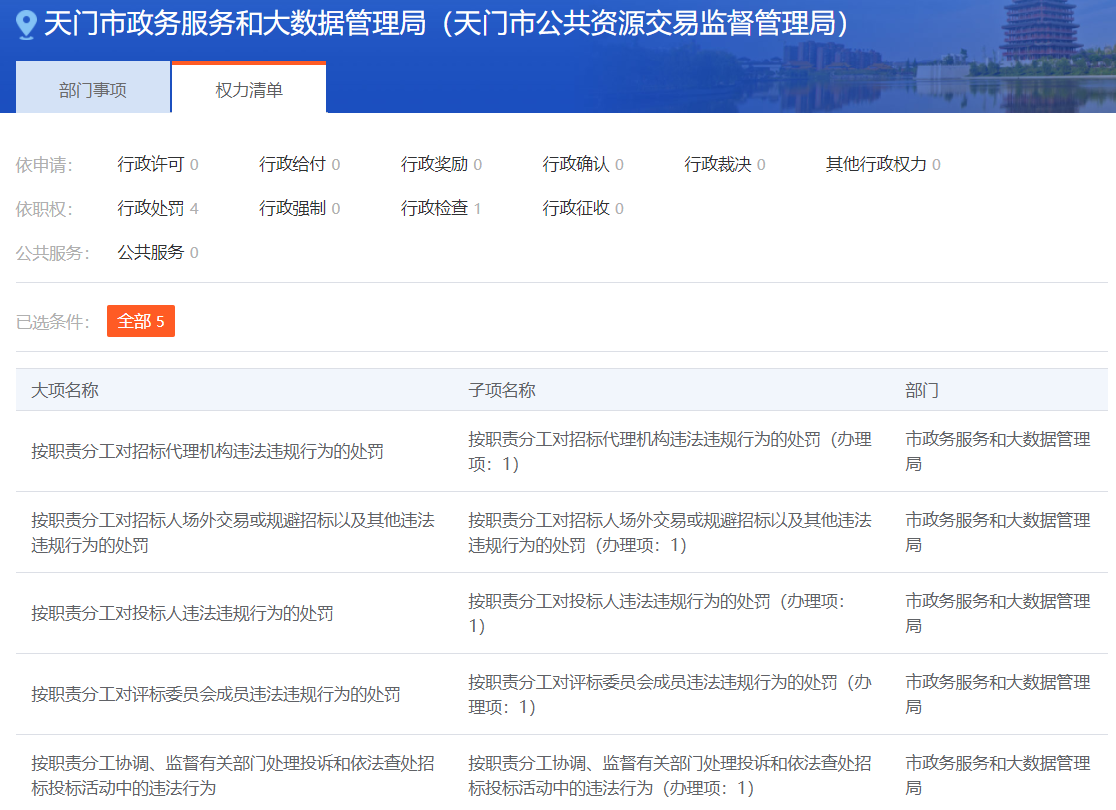 (四)推进公共资源监管事项执法、处罚信息公开。我局通过政府门户网站公开了公共资源交易监督局的行政执法主体和行政执法事项清单,还在湖北省公共资源交易信用信息平台公开了公共资源交易监管行政处罚等下信息。