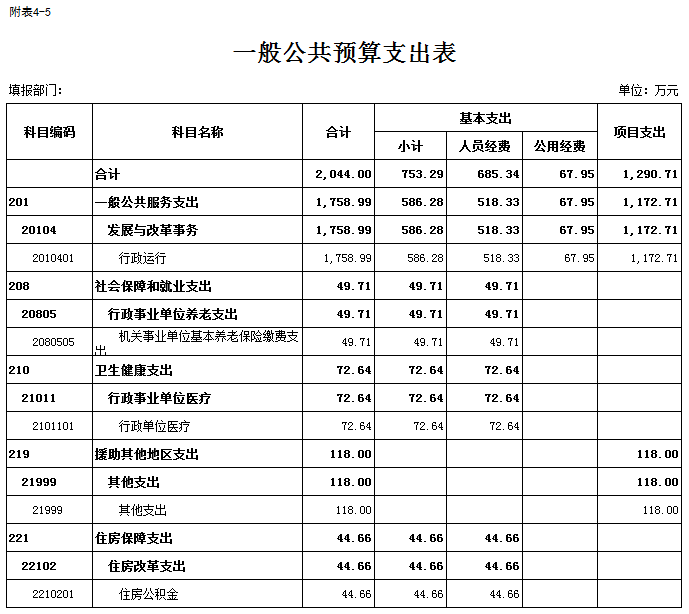 2、预算支出情况:2026年预算支出总额2044万元。其中:人员类项目支出685.34万元, 公用经费项目支出67.95万元,其他运转类项目支出0万元,特定目标类项目支出1290.71万元。本年支出构成为:一般公共服务支出1758.99万元,社会保障和就业支出49.71万元,卫生健康支出72.64万元,援助其他地区支出118万元,住房保障支出44.66万元。支出减少主要原因是:2026年本级项目经费增加,人员减少。