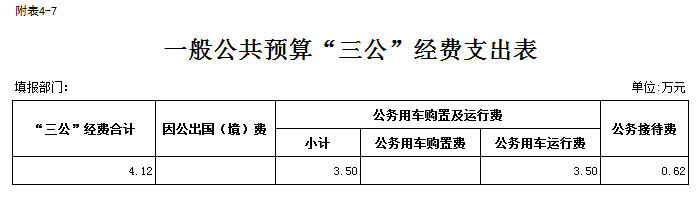 2026年“三公”经费预算4.12万元。包括:公务接待费0.62万元;公车运行维护费3.5万元。