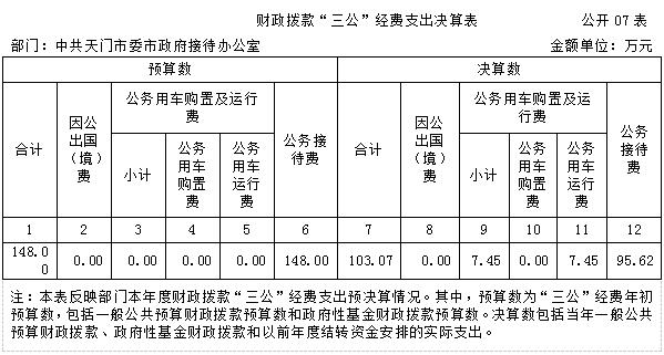 2018年度一般公共预算财政拨款“三公”经费决算数为103.07万元(含机关及所属基层预算单位),其中:因公出国(境)费0万元,公务用车购置及运行维护费7.45万元,公务接待费95.62万元。