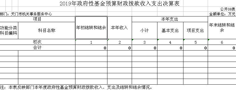 2019年度年初结转和结余0万元;本年收入0万元;本年支出0万元;年末结转和结余0万元。