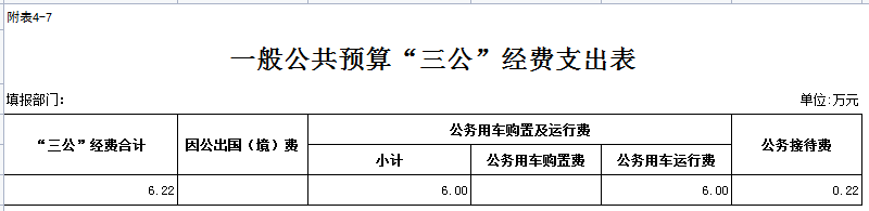 2026年“三公”经费预算6.22万元,较上年预算减少0.06万元,下降0.96 %,其中:公务接待费0.22万元,较上年减少0.06万元,下降21.43%,原因为2025年退休三名职工,故经费减少因公出国(境)经费;公车运行维护费6万元,较上年无变化