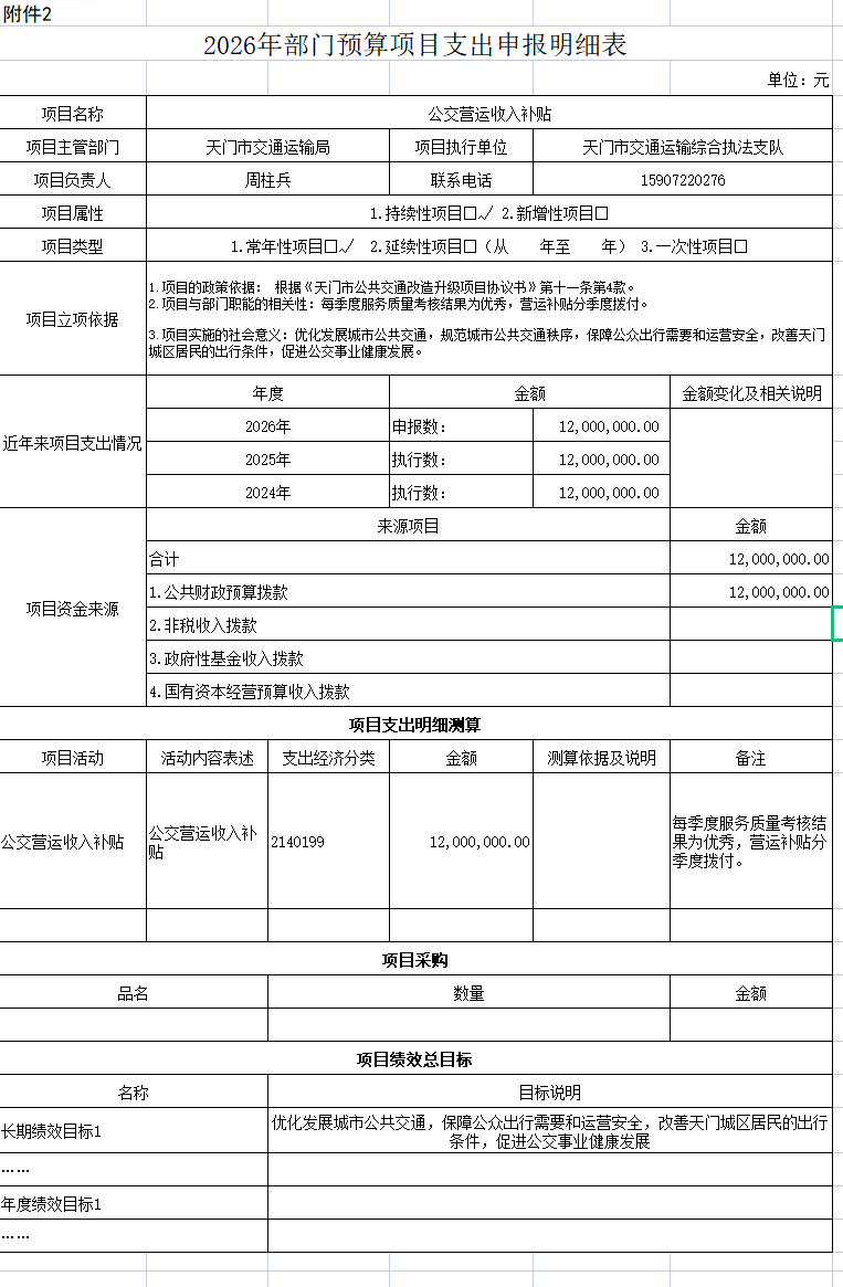 项目理由:根据《天门市公共交通改造升级项目协议书》第十一条第4款,按1200万元/年纳入财政一般预算,用于优化发展城市公共交通,规范城市公路交通秩序,保障公众出行需要和运营安全,改善城区居民的出行条件,促进公交事业健康发展。