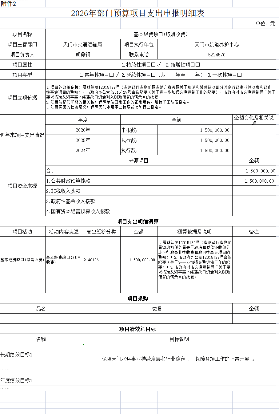 项目理由:为解决天门市交通重点工程项目建设管理处2025年度自收自支人员经费及日常运转公用经费,为促进天门公路建设事业持续发展和行业稳定,保障各项工作的正常开展,依据天门市人民政府收文经费【2023】0991号批示、交通局来文天交通文【2023】117号文《市交通运输局关于解决市交通重点工程项目建设管理处办公及人员经费的请示》,按照交通领域工作专题会议纪要精神,市交通重点工程项目建设管理处自收自支人员经费及日常运转公用经费按照2025年度实际情况为基数测算)292万元实行年度包干预算,并纳入2026年及以后年度预算。