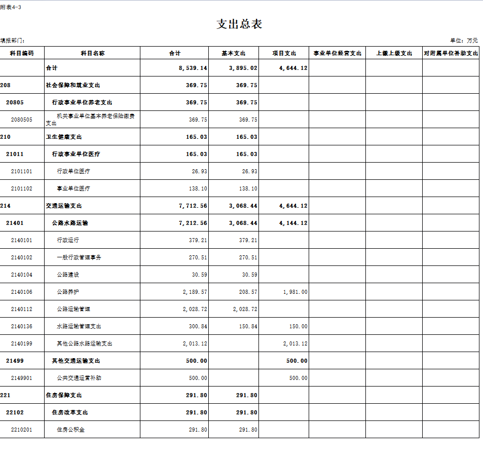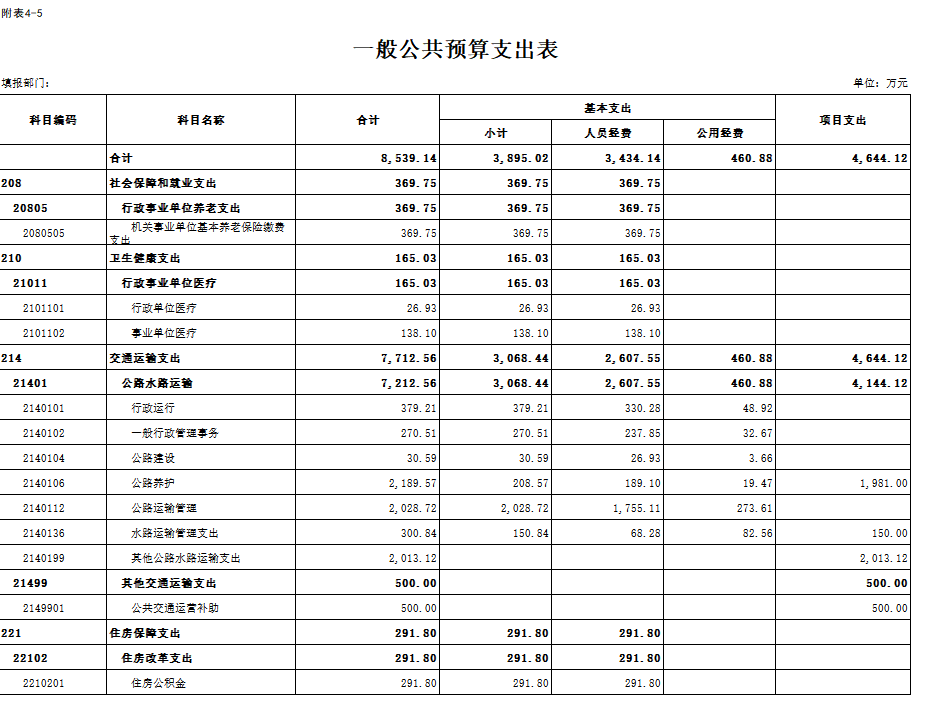 2.预算支出情况:2026年预算支出总额8539.14万元,比上年预算增加96.57万元,增长1.14%。其中:人员类项目支出3434.14万元,公用经费项目支出460.88万元,其他运转类项目支出0万元,特定目标类项目支出4644.12万元。本年支出构成为:社会保障和就业支出369.75万元,占本年支出4.33%;医疗卫生支出165.033万元,占本年支出1.93%;交通运输支出7712.56万元,占本年支出90.32%,住房保障支出291.8万元,占本年支出3.42%。支出增长主要原因是增加了人员经费和志愿兵生活困难补助经费。
