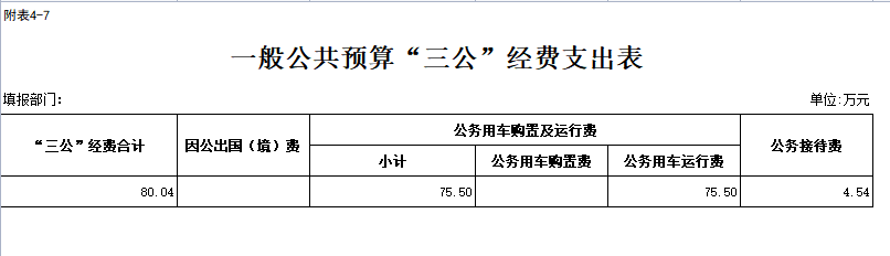 六、“三公”经费:指使用一般公共预算财政拨款安排的因公出国(境)费、公务用车购置及运行维护费和公务接待费。其中,因公出国(境)费用反映单位公务出国(境)的国际旅费、国外城市间交通费、住宿费、伙食费、培训费、公杂费等支出;公务用车购置及运行维护费反映单位公务用车车辆购置支出(含车辆购置税)及租用费、燃料费、维修费、过桥过路费、保险费、安全奖励费用等支出;公务接待费反映单位按规定开支的各类公务接待(含外宾接待)费用。