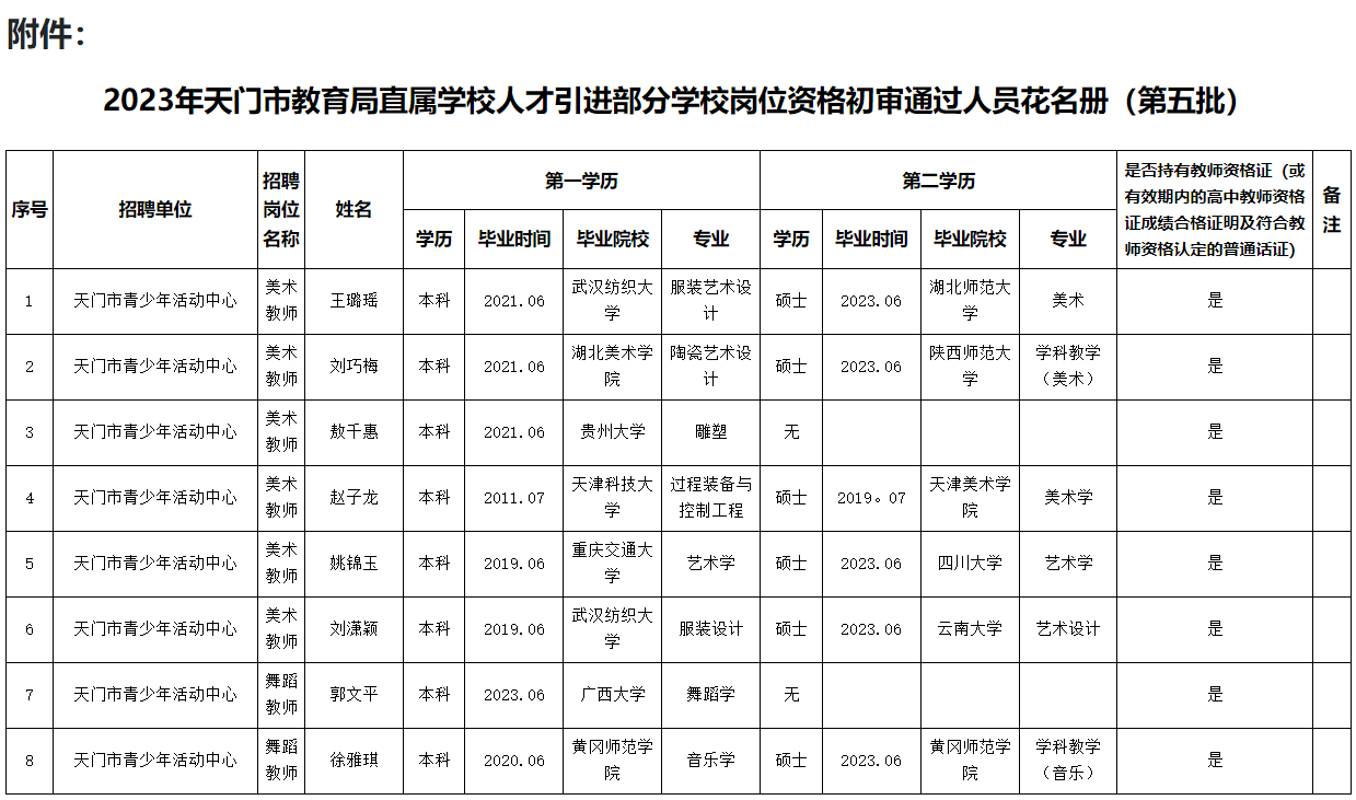 附件:2023年天门市教育局直属学校人才引进部分学校岗位资格初审通过人员花名册(第五批)