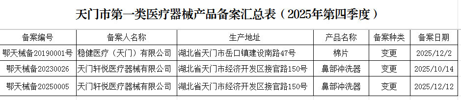 天门市市场监督管理局关于第一类医疗器械产品备案信息公告(2025年第四季度)