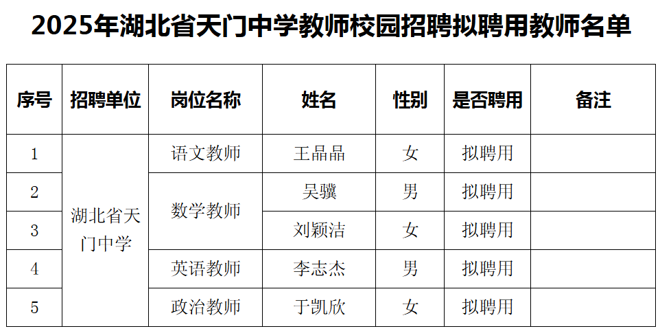 2025年湖北省天门中学教师校园招聘拟聘用教师名单公示