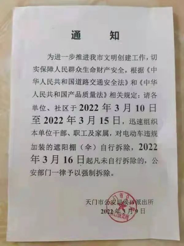 为进一步推进我市文明创建工作,切实保障人民群众生命财产安全,根据《中华人民共和国道路交通安全法》和《中华人民共和国产品质量法》相关规定,请各单位、社区于2022年3月10日至2022年3月15日,迅速组织本单位干部、职工及家属,对电动车违规加装的遮阳棚(伞)自行拆除,2022年3月16日起凡未自行拆除的,公安部门一律予以强制拆除。