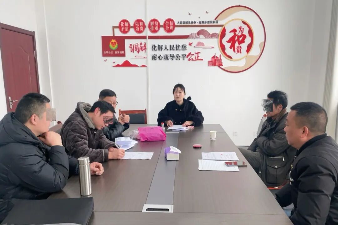 鉴于该起交通事故发生地在黄潭镇,涉及对方当事人为黄潭镇居民,为高效、专业化解纠纷,渔薪司法所立即启动协作机制,与黄潭司法所取得联系,通报情况,商讨调解方案。两所决定发挥属地优势,联合开展调解工作。黄潭司法所迅速联系事故另一方当事人万某某,核实情况,初步沟通;渔薪司法所则持续安抚毛某某情绪,引导其依法理性维权。2026年2月10日,双方当事人、两所工作人员及黄潭镇万场村村干部在黄潭镇人民调解中心共同组织现场调解。