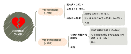 总体来说,心源性猝死中90%的病因为急性心肌梗死。但对于40岁以下的年轻人而言,心源性猝死的病因组成会有所不同。其中70%为结构性病变,另有30%通常由恶性心律失常引起,称为“心律失常性猝死综合征”(SADS)。