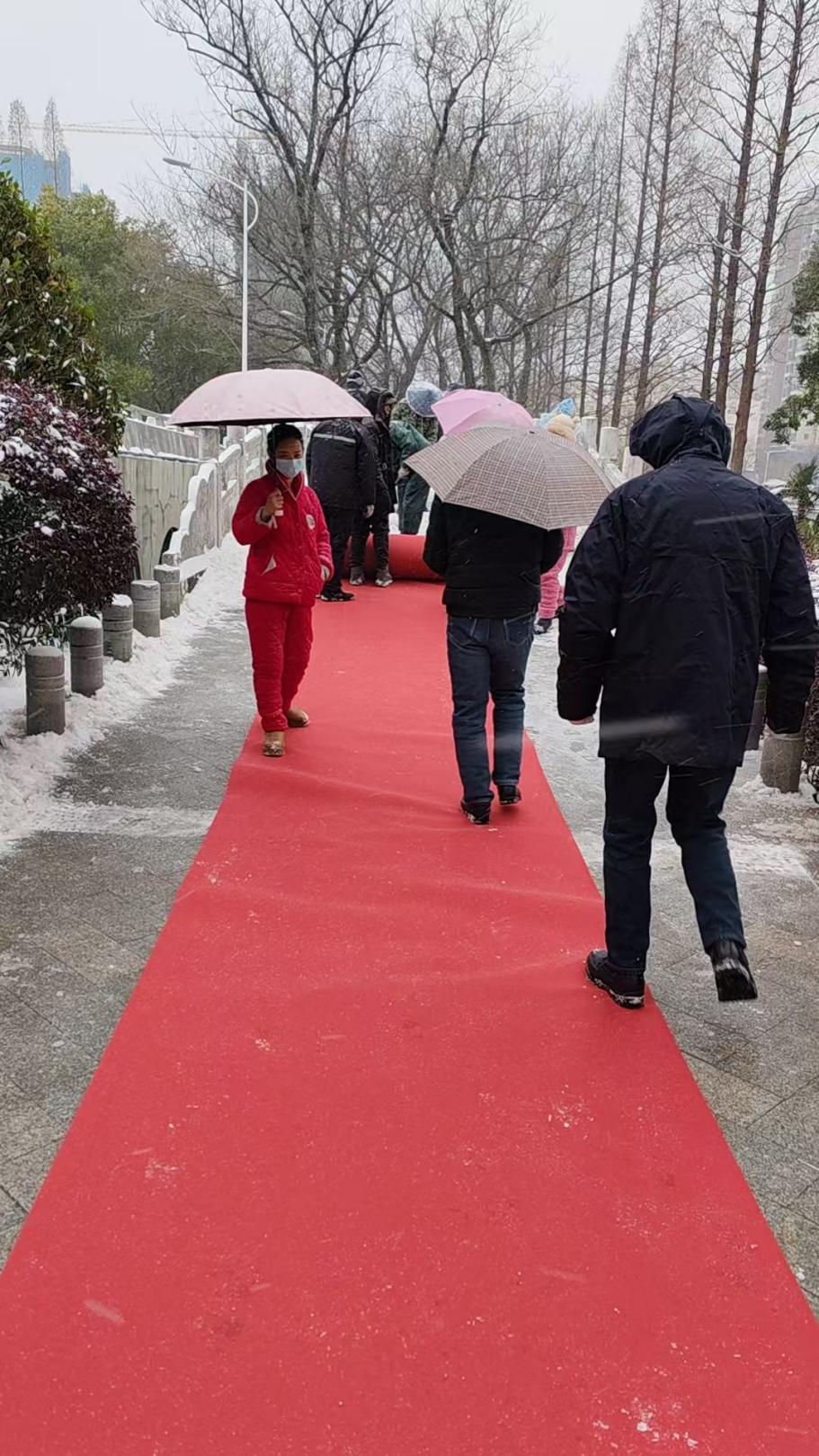 对公园广场开展除雪工作,在桥面铺设红毯保证市民游园安全