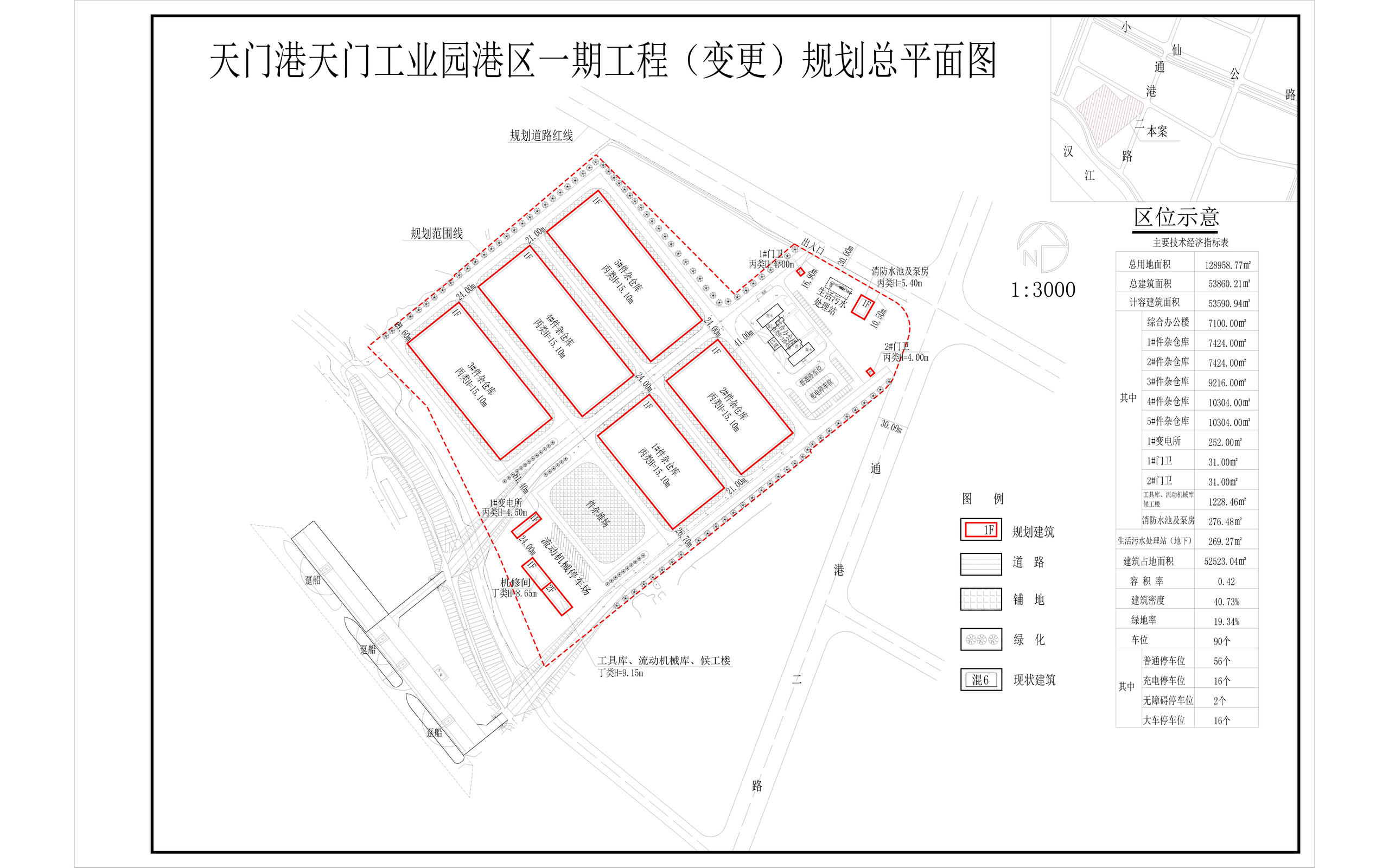 天门市国琪经贸有限公司申报的天门港天门工业园港区一期工程(变更)项目,位于通港二路以西,汉江以北。本次规划方案主要建设:五栋1层丙类件杂仓库,一栋1层变电所,一栋1层机修间,一栋2层工具库、流动机械库、候工楼,一栋1层消防水池及泵房,两栋1层门卫,以及相关配套设施,具体详见规划总平面图、效果图。经我局审查,拟同意批准该项目规划方案,现将拟批准的规划总平面图予以公示。有关单位或个人如对此规划有异议,请在公示期间向市自然资源和城乡建设局多祥管理所提出书面异议书。